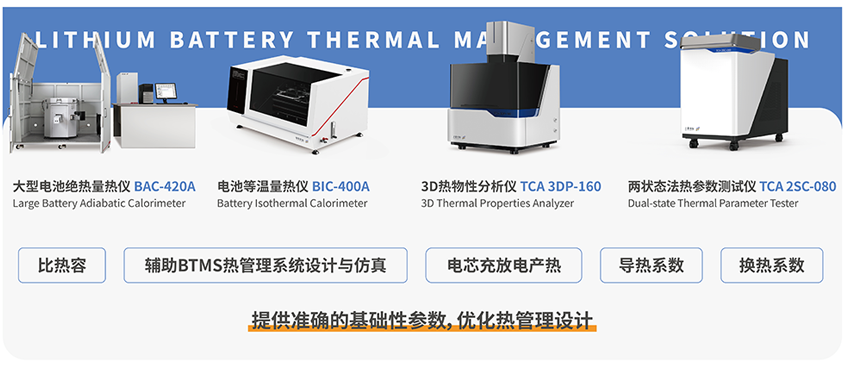 熱管理測(cè)試解決方案可對(duì)電池包或系統(tǒng)的熱擴(kuò)散特性進(jìn)行驗(yàn)證,獲取電池絕熱溫升、電池導(dǎo)熱系數(shù)等熱管理仿真核心參數(shù),確保電池產(chǎn)品滿足國家安全標(biāo)準(zhǔn)的要求。