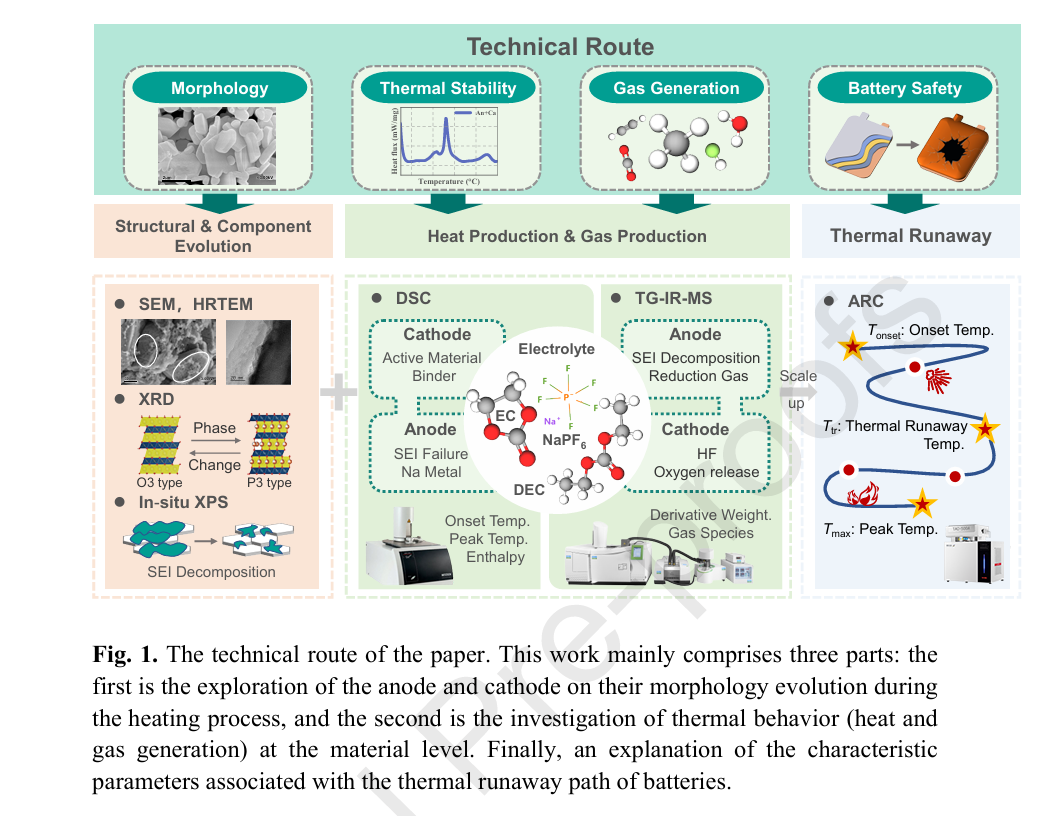 為實現(xiàn)對NFM/HC材料組合多層次的熱安全理解,研究采用了特定的技術路線對鈉離子電池從材料到電池層級的熱穩(wěn)定性進行深度剖析。具體包括: