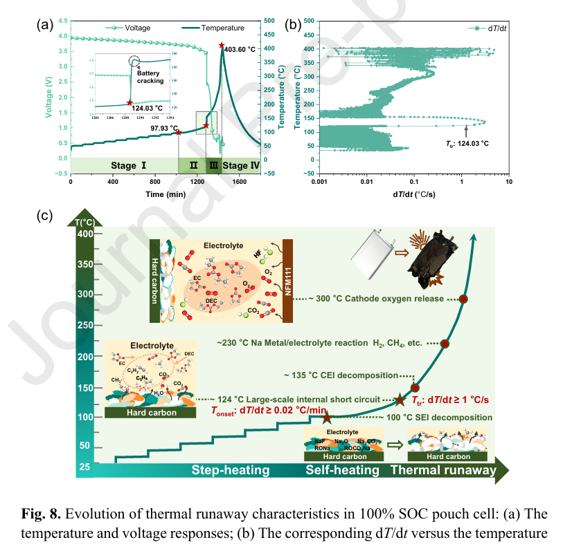 研究團隊采用TAC-500A的HWS(加熱-等待-搜尋)模式,對充電至100%SOC的軟包電池進行絕熱熱失控測試。為確保測試準確性,將加熱步驟設為10°C,等待時間設為60min,以此保證電池與ARC測試腔溫度一致。通過這一嚴謹?shù)膶嶒炦^程,成功獲取了NFM/HC全電池體系在絕熱熱失控過程中的三個關鍵特征參數(shù):