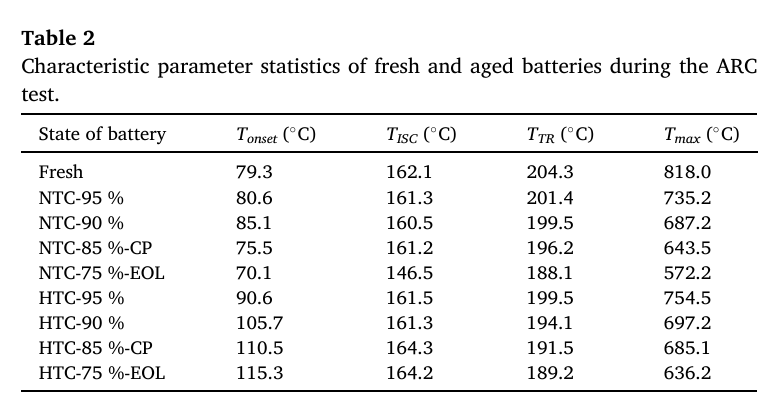 本研究采用小型電池絕熱量熱儀BAC-90A對在不同退化路徑下老化至特定狀態(tài)的電池進行絕熱熱失控測試。獲取了自發(fā)熱起始溫度(Tonset)、內部短路觸發(fā)溫度(TISC)、熱失控起始溫度(TTR)和熱失控最高溫度(Tmax)四個熱失控特征參數(shù)。結果表明高溫循環(huán)和常溫循環(huán)老化過程中的熱失控特性存在顯著差異。
